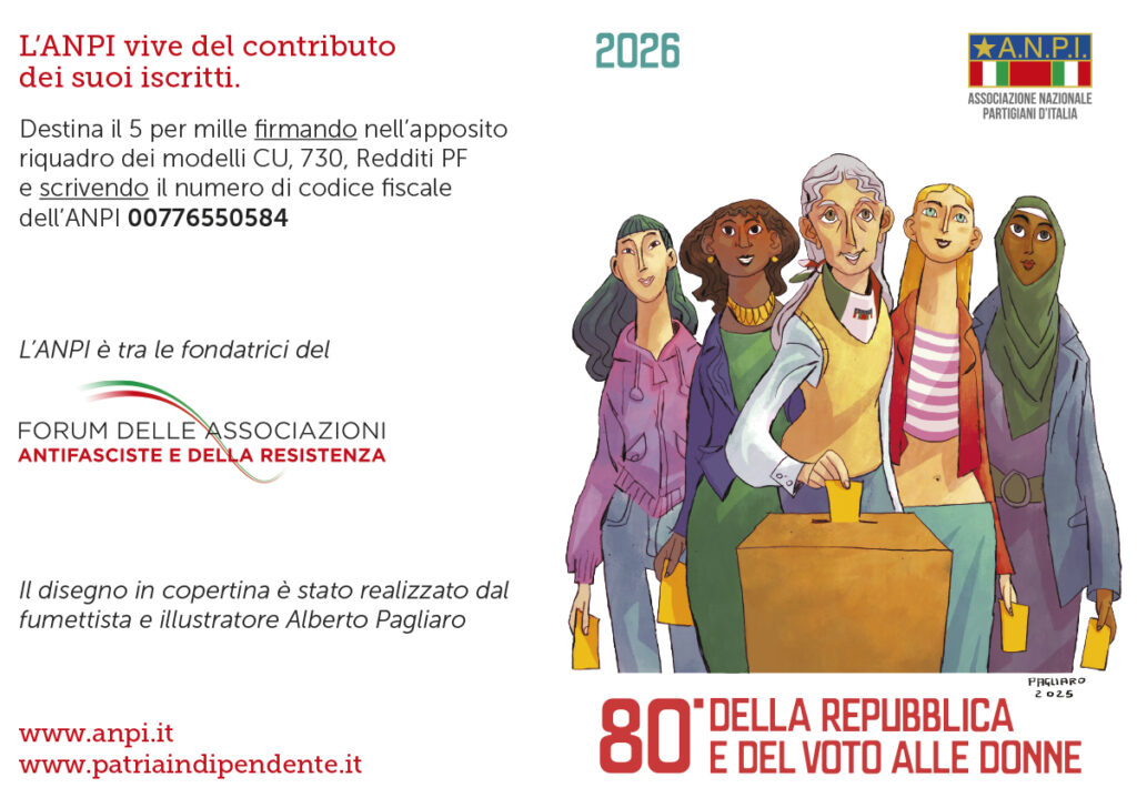 L’Associazione Nazionale Partigiani d’Italia nasce come ente morale il 5 aprile del 1945 (decreto legge n° 224) e riunisce tutti coloro che hanno partecipato, con azione personale diretta, alla guerra partigiana contro il nazifascismo per la liberazione dell’Italia e tutti coloro che, lottando contro i nazifascismi in qualsiasi forma, hanno contribuito a dare al nostro paese la libertà in un regime di democrazia e continuano a battersi per impedire che il fascismo, anche in forme mascherate, rinasca. L’ANPI partecipa allo sviluppo morale e materiale dell’Italia. Tutela l’onore delle donne e degli uomini della Resistenza contro vilipendio e speculazione. Mantiene vincoli di fratellanza tra i partigiani italiani e i partigiani di altri paesi. Adotta forme di assistenza alle famiglie dei caduti e a coloro che hanno sofferto nella lotta contro il fascismo. Promuove studi sulla Resistenza. Si batte affinché i principi e i valori di libertà e uguaglianza portati dai partigiani tutti vengano assunti come elementi essenziali nella formazione delle giovani generazioni; aiuta e collabora con quanti si battono affinché la democrazia diventi un valore universale e condiviso.